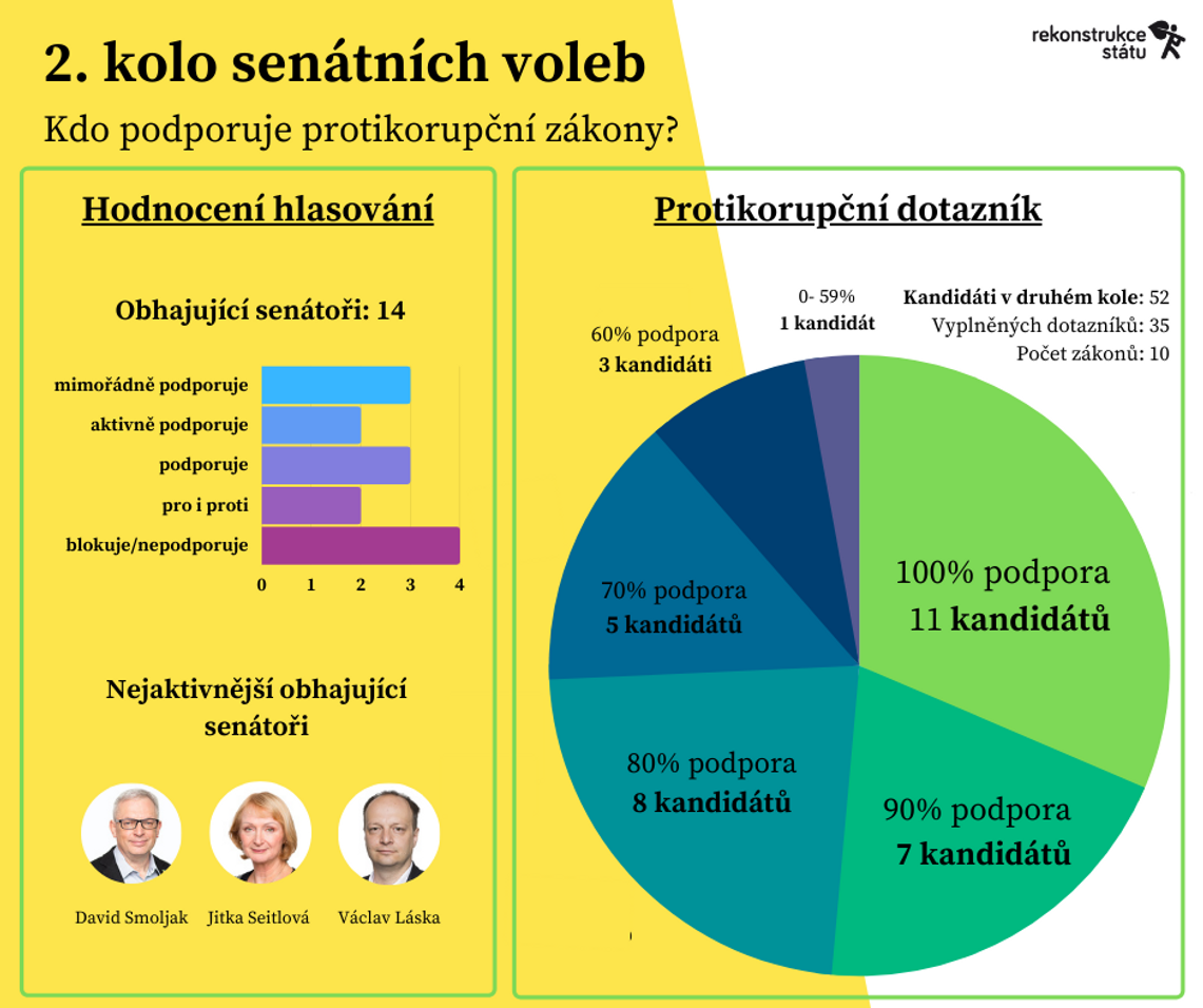 Z celkem 52 kandidátek a kandidátů, pro které volební klání pokračuje, jich dotazník vyplnilo 35. Pokud by jim protikorupční zápal vydržel i ve funkci, o osud protikorupčních zákonů v Senátu nemusíme mít přílišné obavy. Jedenáctka kandidátů (Vladimír Drápal, Daniel Kůs, Adéla Šípová, Pavel Kárník, Miroslav Antl, Jan Grulich, Josef Klement, Michal Šmarda, Jitka Seitlová, Helena Pešatová, Zdeněk Jiříček) se přihlásila k plné podpoře všech 10 opatření. Dalších sedm kandidátů by podpořilo 90 % a osm kandidátů 80 % zákonů. Pouze jeden kandidát avizoval menší než 60% podporu.