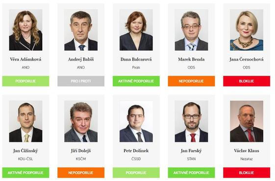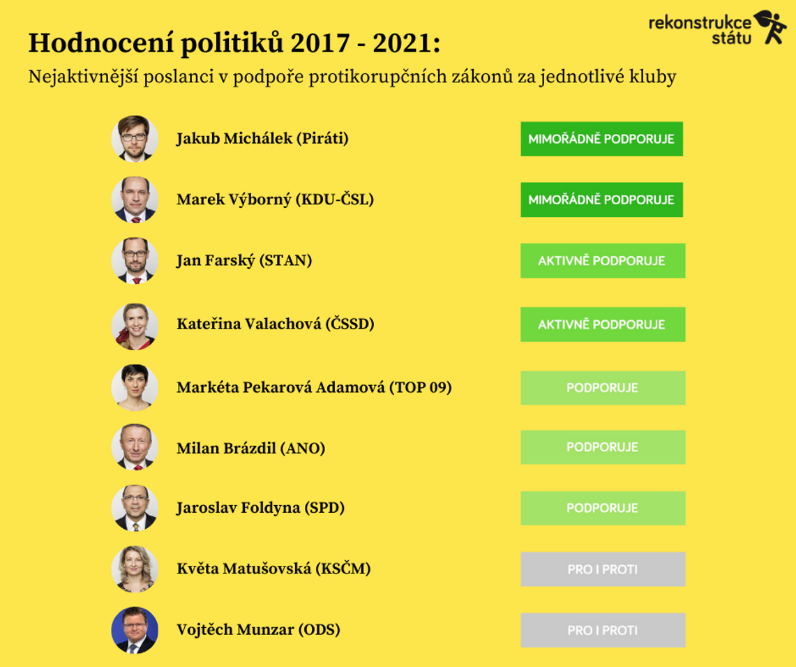Celkem 111 poslanců protikorupční legislativu podporuje, 25 z nich ji podporuje aktivně a 6 mimořádně aktivně. Na bednu se přitom podle hodnocení zatím vyšplhali Jakub Michálek z Pirátů, Marek Výborný z KDU-ČSL a Ondřej Profant (Piráti). Největšími blokátory opatření jsou naopak Jana Černochová (ODS), Jana Levová (SPD), Václav Klaus mladší, Marian Bojko a Tereza Hyťhová (všichni tři nezařazení).