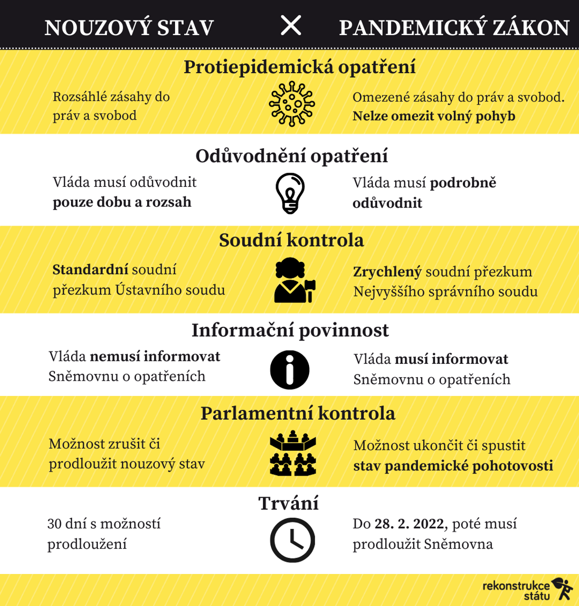 Pandemický zákon: Kontrolu výrazně posiluje. Vláda musí o všech opatřeních i jejich změnách informovat každé dva týdny Sněmovnu a v případě žádosti poslance nebo senátora o informace ji vyřídit do 15 dnů. Opatření musí být při vyhlášení důsledně odůvodněna v kontextu vývoje pandemie i rizik, kterým mají předcházet. Zlepší se i soudní kontrola. Opatření bude přezkoumávat Nejvyšší správní soud (v případě opatření ministerstva) nebo krajské soudy (v případě opatření hygien), a to zrychleně.