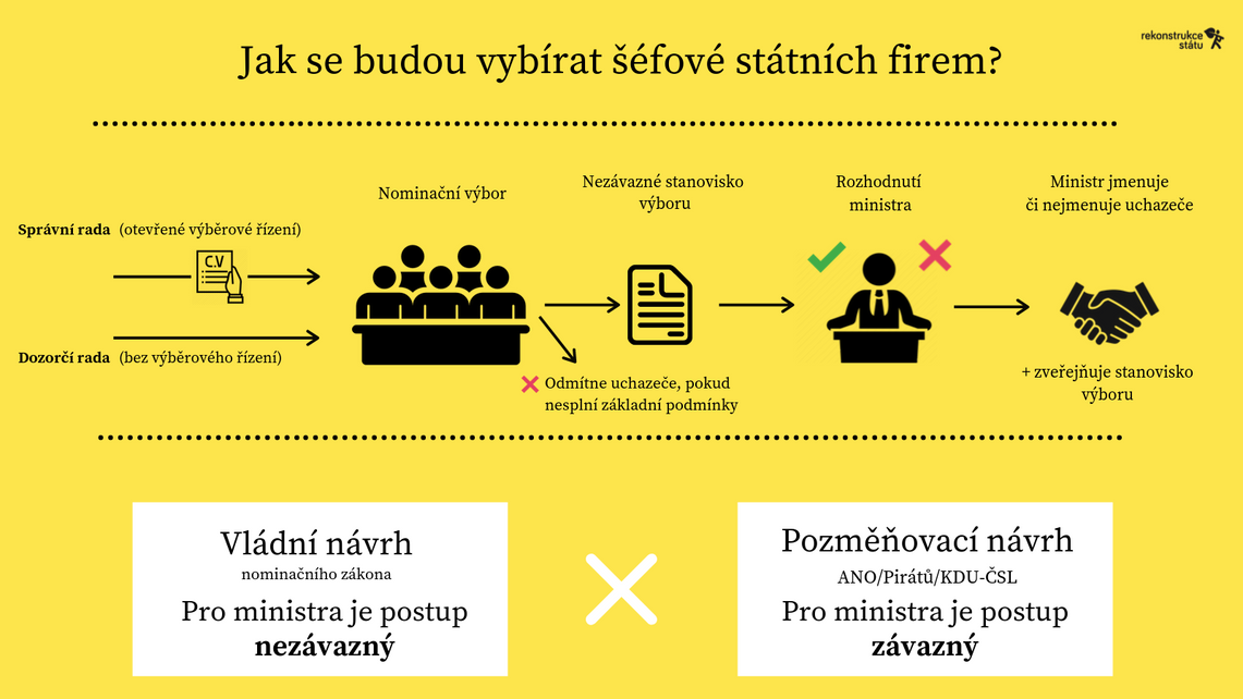 V minulém volebním období zákon ve Sněmovně neuspěl. Vloni pak ztroskotal také ambiciózní návrh Pirátů. Ten inspiroval k předložení nového zákona současnou vládu. Vládní návrh však původně obsahoval nedostatky, které Rekonstrukce státu kritizovala. Především by postup stanovený zákonem nebyl pro ministry vůbec závazný. Výbor pro personální nominace také v původním vládním návrhu nemohl vyloučit zjevně nezpůsobilé kandidáty z výběrového řízení. Poslancům se ve spolupráci s Rekonstrukcí státu naštěstí podařilo najít kompromis, který tyto zásadní chyby napravuje.