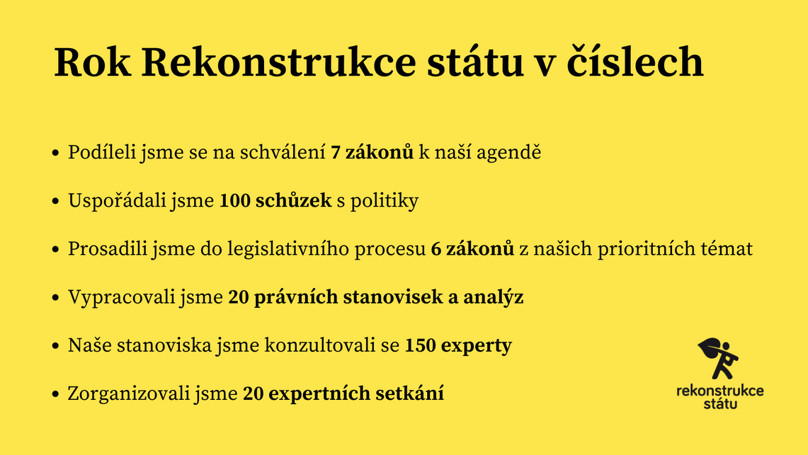 Rekonstrukce státu od roku 2013 prosadila už 15 zákonů proti korupci. Ani letos jsme neseděli v koutě a nečekali, až politici sami přijdou požádat o protikorupční taneček. Absolvovali jsme přes 100 schůzek s politiky a do legislativního kolečka poslali 6 zákonů s našimi prioritami. Dotáhli jsme 7 zákonů či novel z naší agendy, které již v legislativním procesu byly. Vzhledem k tomu, že politikou v současnosti hýbou i další palčivá témata, jde o výborný start.