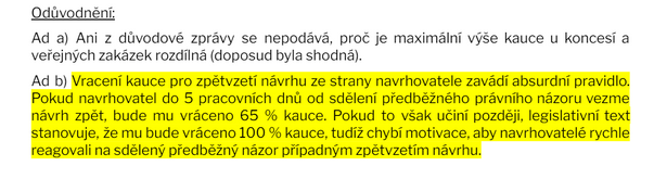 Samotná připomínka Hospodářské komory ČR se přitom jeví jako celkem opodstatněná. Komora poukazuje na riziko vyplývající z nedostatečného nastavení podmínek pro vracení kauce, kdy hrozí, že navrhovatelé nebudu mít motivaci v řízení rychle reagovat.