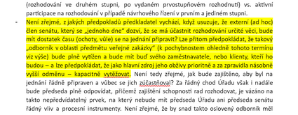 Za zmínění stojí i připomínka ÚOHS (viz níže) vztahující se k externím členům senátu, ve které Úřad vznáší obavy nad tím, že by externí člen senátu nemusel mít na tuto roli čas, protože bude mít vlastní zaměstnání, které ho bude plně zaměstnávat. To je ze strany ÚOHS zvláštní kritika, protože přesně takto dnes fungují členové rozkladových komisí Úřadu, kteří jsou externisté a svou funkci vykonávají typicky vedle jiné práce na plný úvazek. ÚOHS tak podkopová svou obhajobu stávajícího systému.