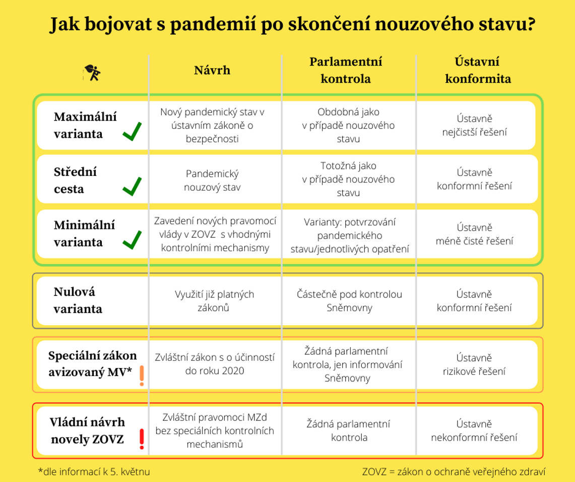 Jsme přesvědčeni, že smysluplné a ústavně souladné varianty existují a že lze nalézt širokou odbornou i politickou shodu, jak vládě zajistit i po ukončení nouzového stavu jasný a široce respektovaný právní rámec pro realizaci nezbytných opatření. Řadu řešení už jsme ostatně vládě popsali a nyní zaslané informace doplňujeme ještě o přehled základních možných variant řešení. V hledání nejvhodnějšího řešení jsme nadále připraveni vládě a vládním stranám pomoci (stejně tak jako zástupcům opozice).