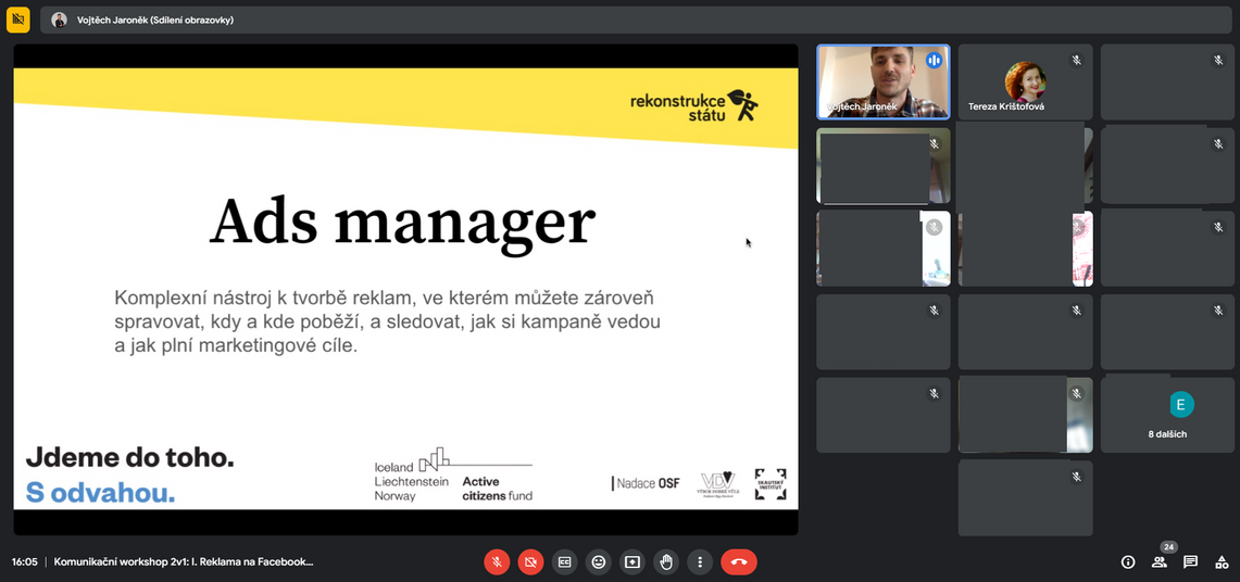 Šlo jednak o dlouhodobé partnery Rekonstrukce státu, ale také o členy námi koordinované Sítě k ochraně demokracie, kteří mohou prezentované dovednosti (správa reklam na platformě Meta, hromadný e-mail marketing, SEO s důrazem na analýzu klíčových slov) uplatnit u svých projektů a pomoci tak zesílit hlas občanské společnosti v Česku.