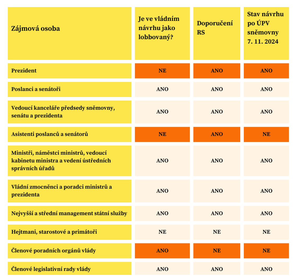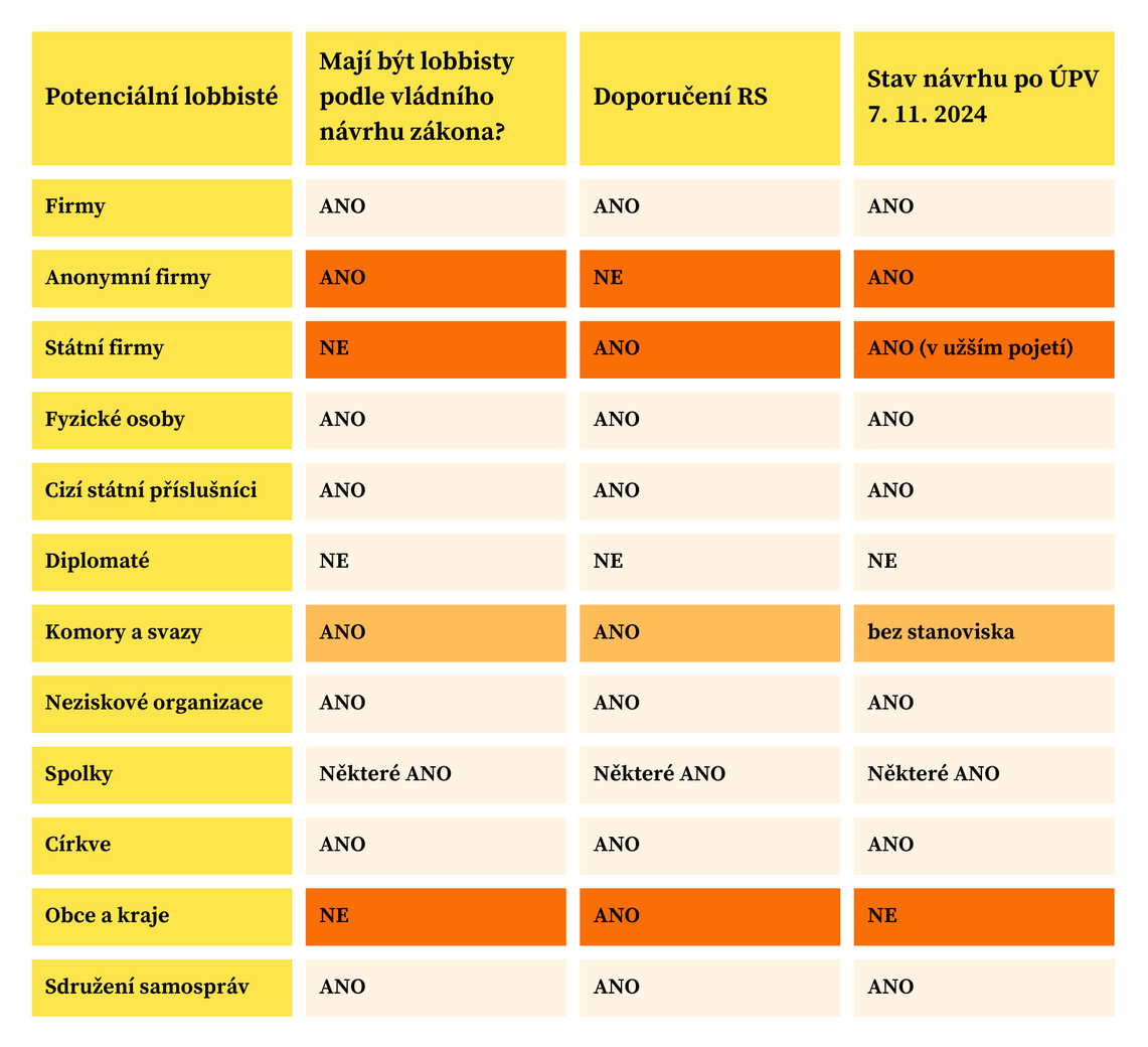 * Dle §3, se lobbistou rozumí osoba (subjekt), která lobbuje soustavně, a to také obce a kraje, svazy obcí a krajů, profesní komory, sdružení zaměstnavatelů a zaměstnanců, svazy firem, církví a náboženských společností, církve a náboženské společnosti.