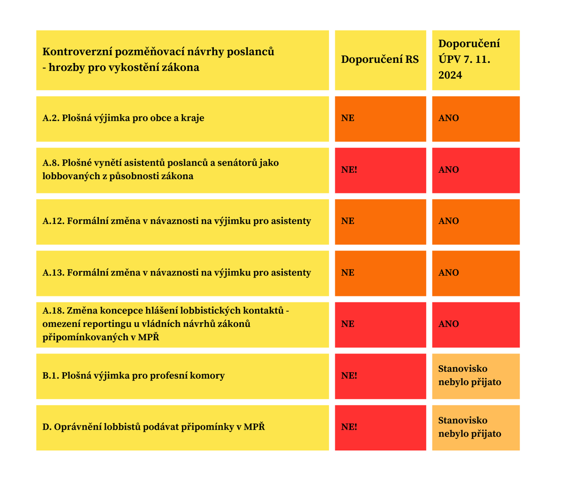 Poslanci předložili k návrhu zákona o regulaci lobbování doposud velké množství pozměňovacích návrhů - celkem 27. Některé jsou přínosné, ale část z nich bohužel směřuje k vykostění zákona, protože zavádí plošné výjimky. Každá nesystémová výjimka přináší velký prostor pro obcházení zákona. Rekonstrukce státu varuje hlavně před 2 výjimkami: