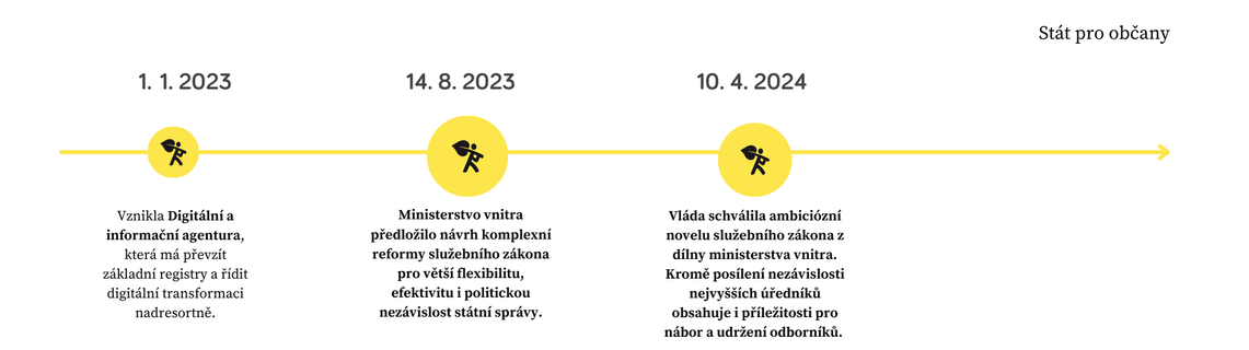 Vláda by měla již brzy jednat o chystané komplexní novele služebního zákona. Ministerstvo vnitra pod vedením Víta Rakušana (STAN) předložilo slibný návrh, který se zaměřuje na zefektivnění státní správy, posílení pojistek proti politizaci a omezení resortismu. Po meziresortních připomínkách návrh nově zahrnuje i kariérní růst odborníků ve státní správě. Novela však stále nepočítá s proměnou role státních tajemníků tak, aby byli více odpovědní za chod ministerstev a plnění jejich priorit.